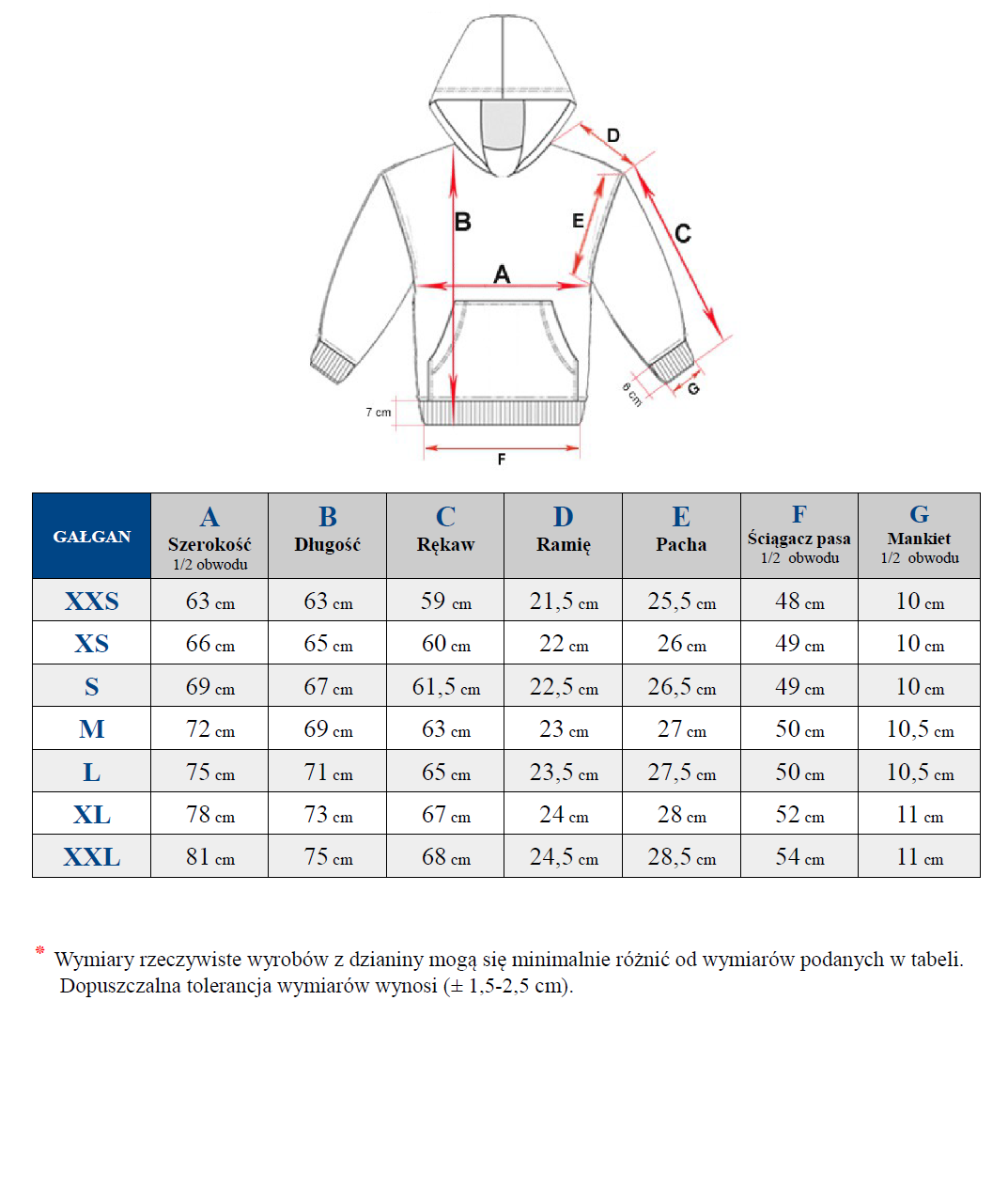 Przed zamówieniem proszę porównaj rozmiary swoich bluz z naszą rozmiarówką. Rozmiary podane są dla bluzy leżącej na płasko.