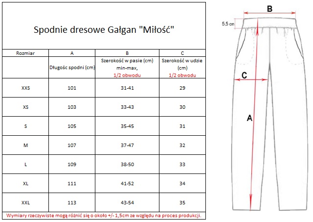 Przed zamówieniem proszę porównaj rozmiary swoich spodni z naszą rozmiarówką. Rozmiary podane są dla ubrania leżącego na płasko.