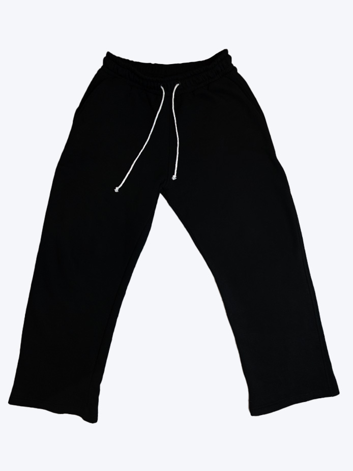 Spodnie w pasie mają gumkę oraz sznurek jako ściągacz, a nogawki są szerokie, bez ściągacza. Napis