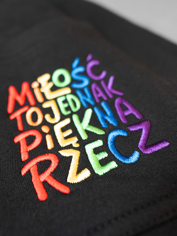 "Miłość to jednak piękna rzecz" wykonany jest jako haft na tylnej kieszeni.